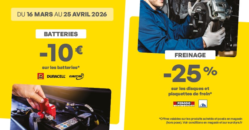 Du 16 mars au 25 avril 2026, profitez des promotions sur les batteries* et sur les disques et plaquettes de frein*